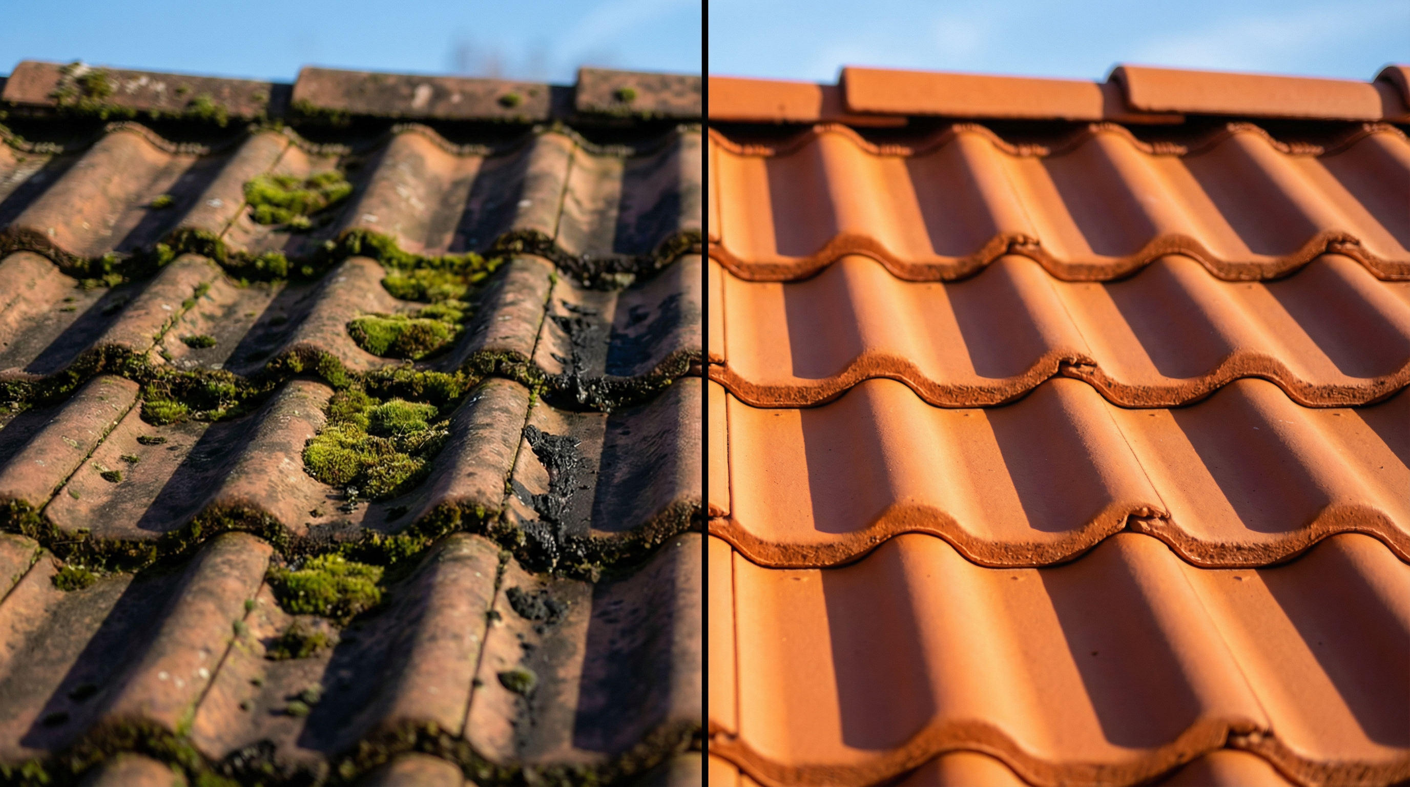 Links: Dach mit Moos und Algen | Rechts: Nach professioneller Reinigung